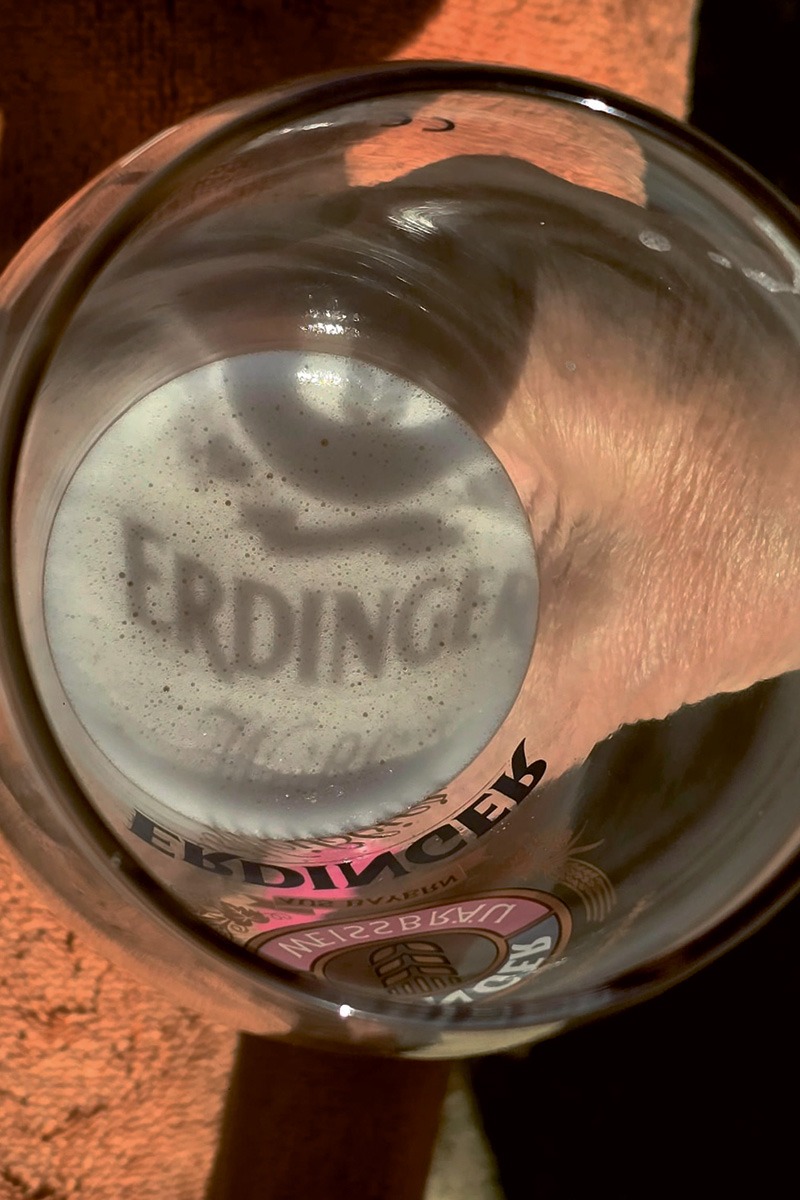 Beate Waldau genießt ihr ERDINGER Weißbier in der Sonne und das ganz besondere Schattenspiel im Weißbierglas.