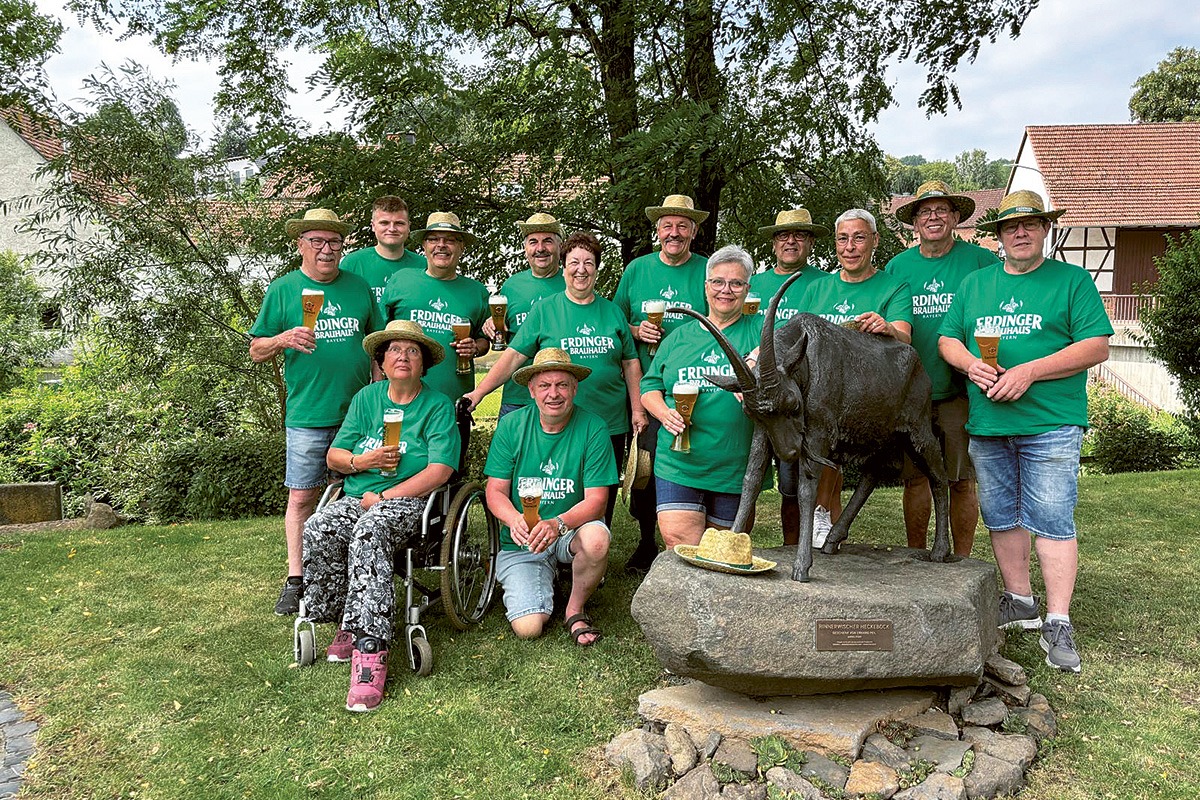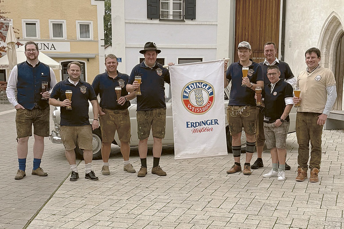 Bereits zum zweiten Mal haben die ERDINGER Weißbierfreunde Rinderbügen ein Dorfplatzfest ausgerichtet. Beim Gruppenfoto durfte das Ortsmaskottchen nicht fehlen.