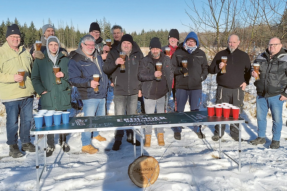 Hauke Janßen und sein Stammtisch spielten vor ihrer alljährlichen Winterwanderung ein kleines Beerpong-Turnier im Schnee. Passend zur Jahreszeit mit der ERDINGER Schneeweißen.