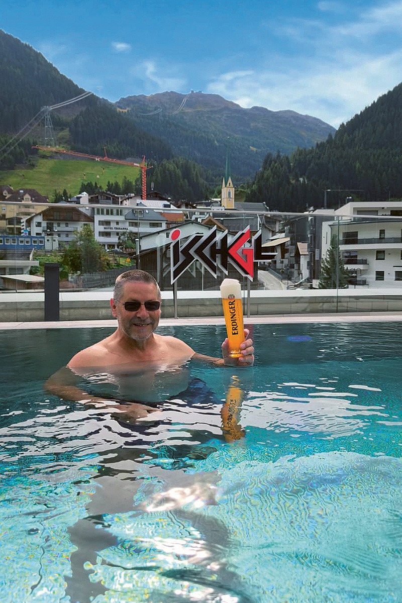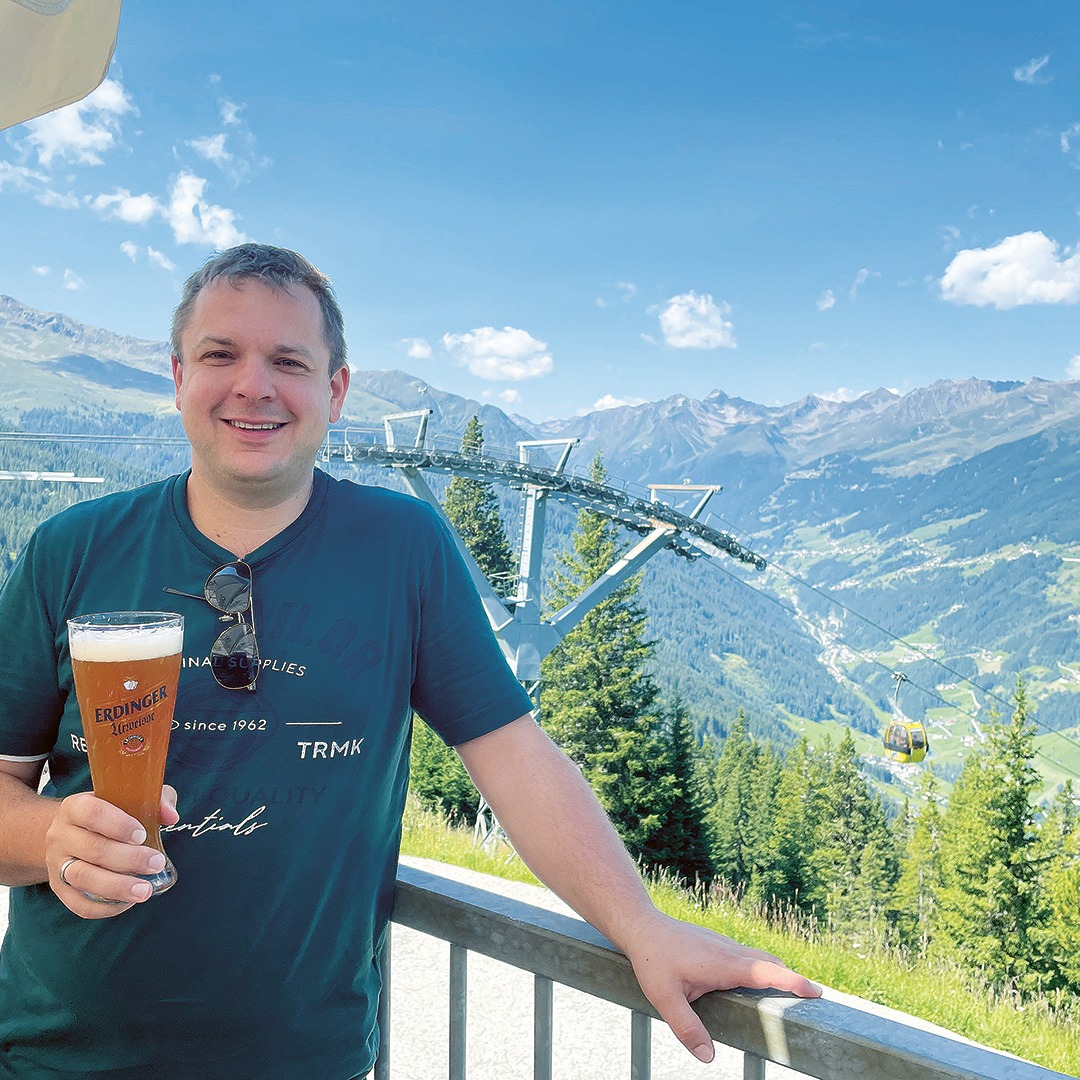 Christoph Schwarz vom Fanclub Grebenauer ERDINGER Buben gönnt sich eine ERDINGER Urweisse bei bestem Bergpanorama im Paznauntal.