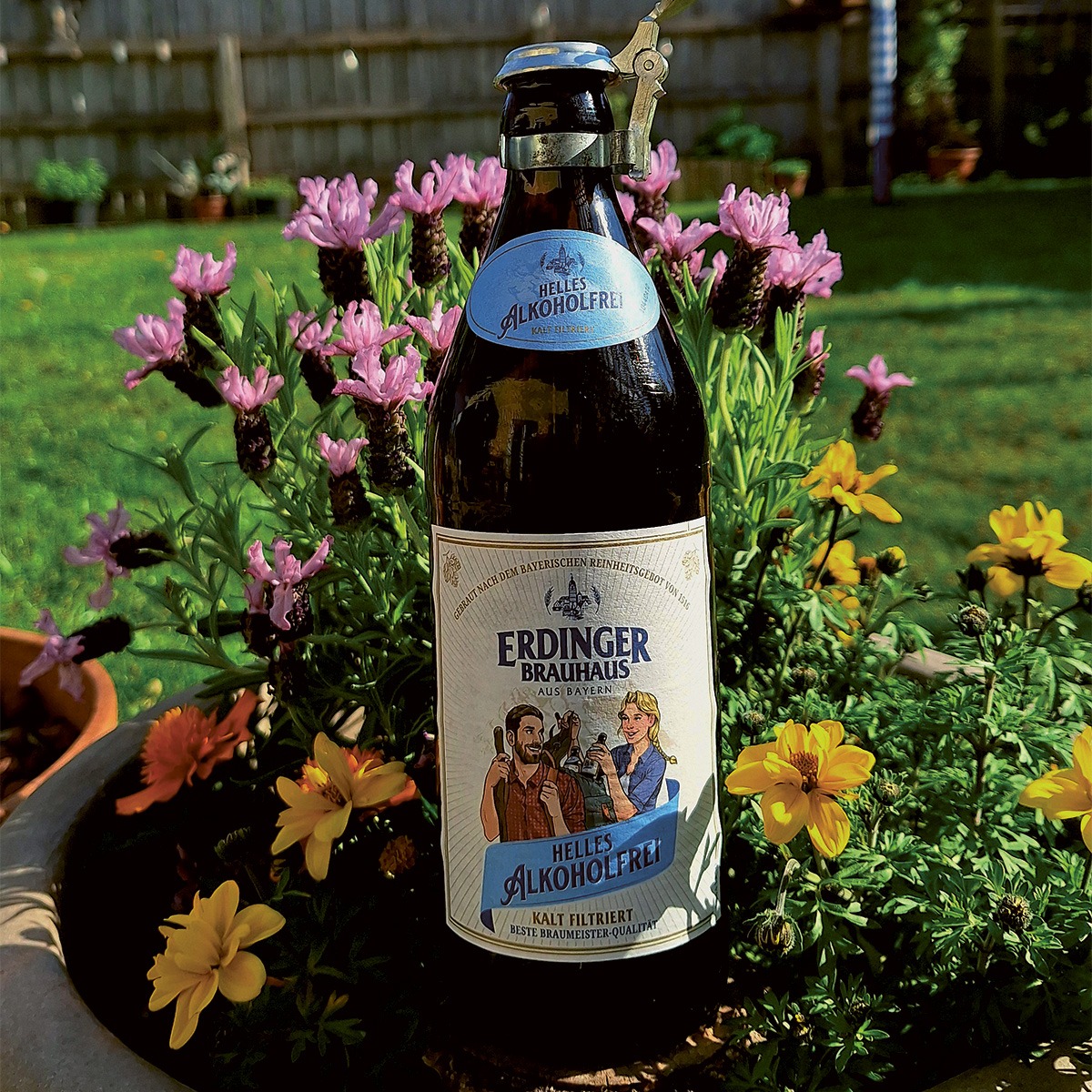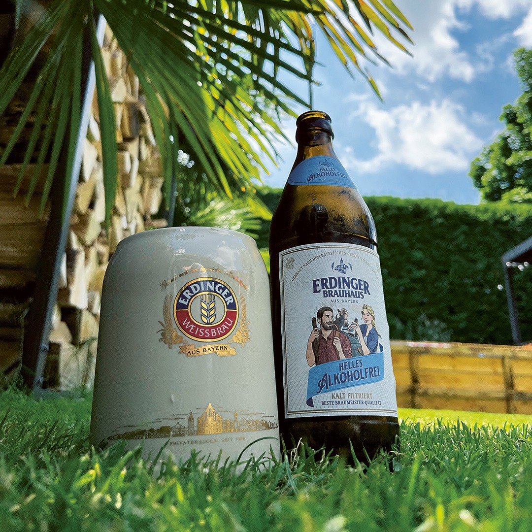 Martl Maierthaler genießt nicht nur den strahlenden Sonnenschein und seinen Garten, sondern auch das ERDINGER Brauhaus Helles Alkoholfrei.