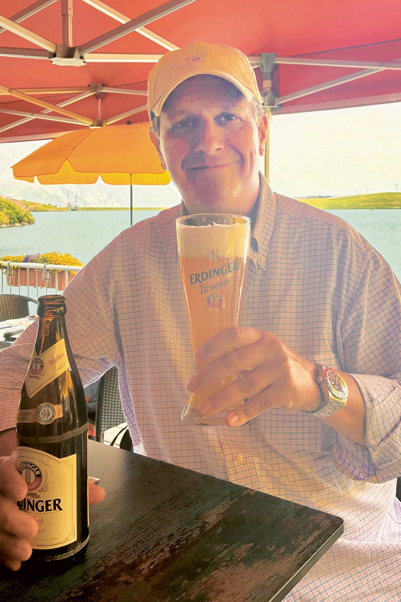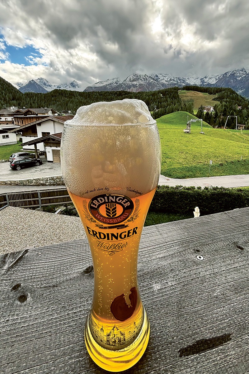 Markus Titze genießt diesen herrlichen Ausblick in Tirol mit einem herrlichen ERDINGER Weißbier.