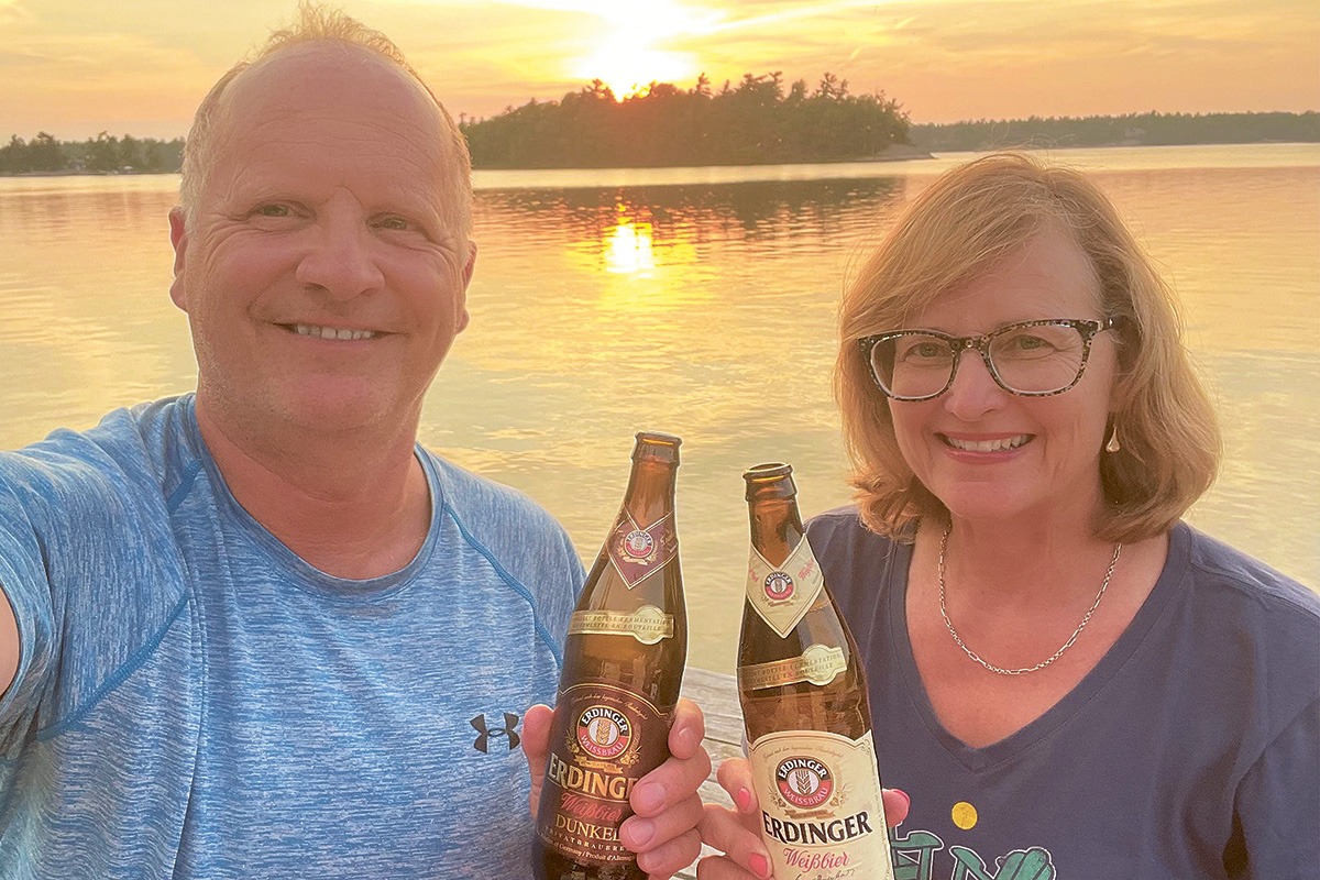 Beim Sonnenuntergang im kanadischen Georgian Bay stoßen Dee Steimle und Steve Turner mit einem ERDINGER an.