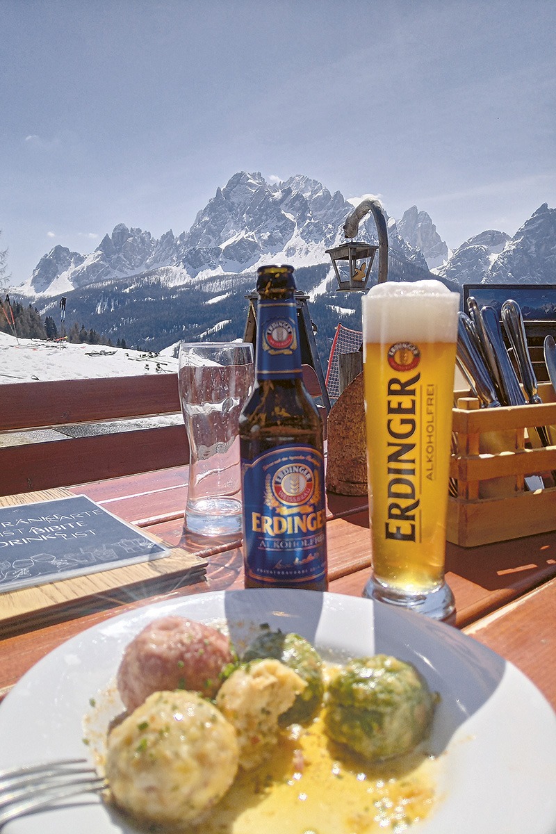 It’s a Match: Knödel, Berge und ERDINGER. Stephan Gasser gönnt sich bei einer Wanderung in den Dolomiten eine schmackhafte Pause.