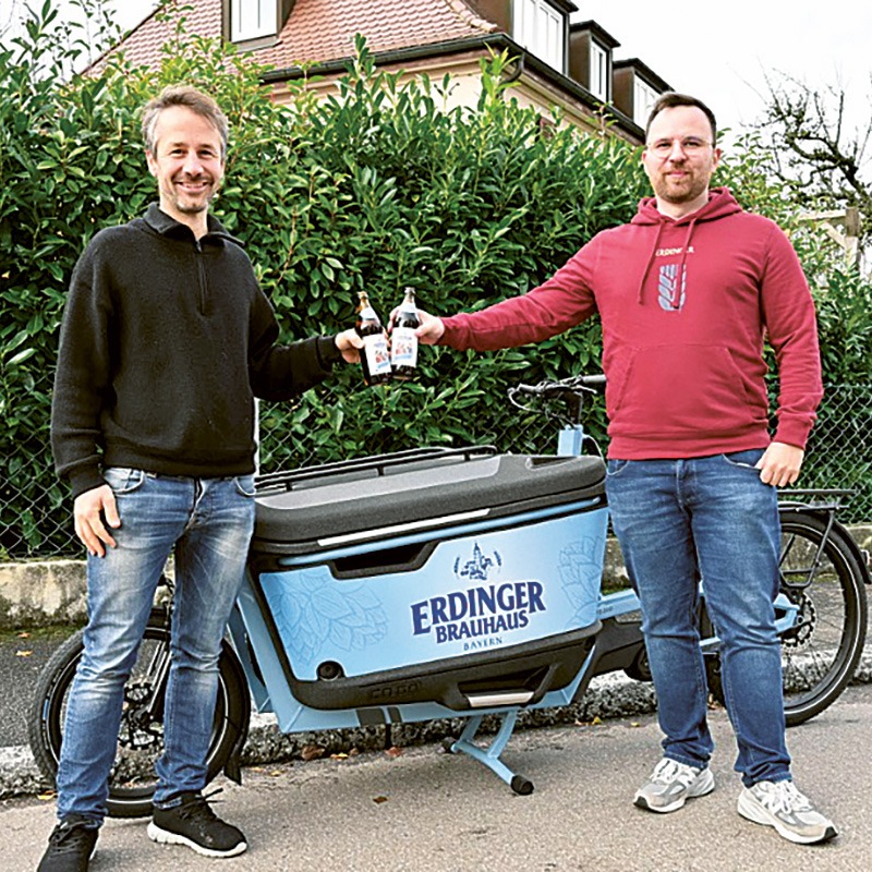 Christoph aus Stuttgart gewann bei unserem großen ERDINGER Sommermärchen den Hauptpreis. Unser Mitarbeiter Pascal überreichte ihm das E-Lastenrad von Ca Go Bike im ERDINGER Brauhaus Alkoholfrei-Design persönlich.